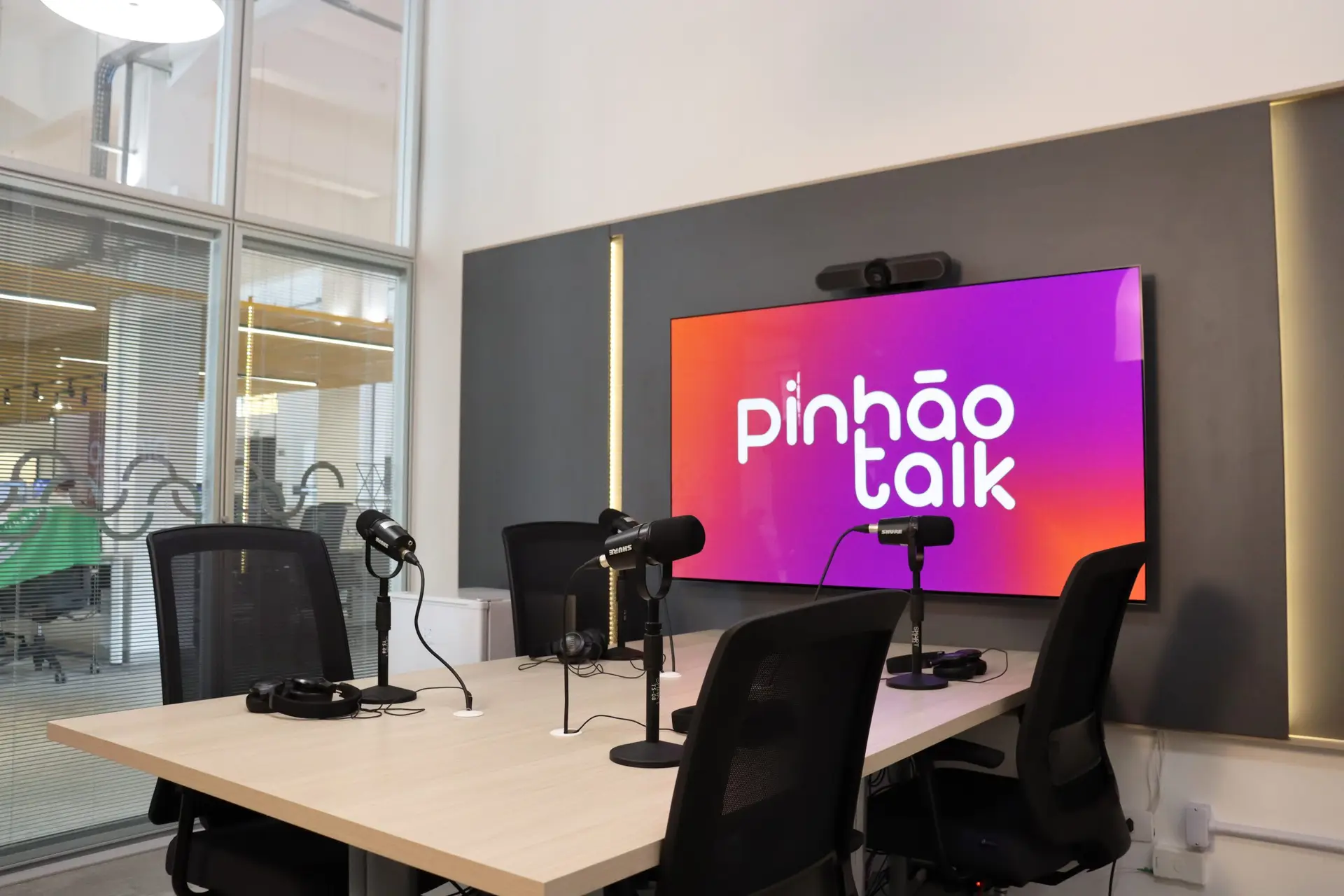Grave seus episódios na sala de podcast do Pinhão Hub – um espaço completo com todos os recursos necessários para sua gravação.